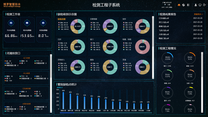 检测系统拥有检测管道数据分析管理模块,能快速高效地处理检测管道入库数据,并提供成果数据分析。检测系统的数据分析管理涵盖工程工作量分析、河涌排放口分析、缺陷类别与等级分析、道路级缺陷点分析、检测成果报告、缺陷分布等整体情况分析。通过分析成果数据全面掌握工程实施状况,全面了解项目实施的进度及质量情况。