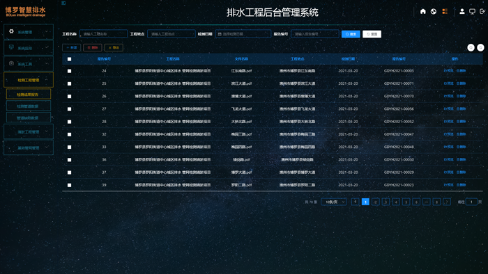 庄闲和游戏智慧管网系列软件是我司独立自主的研发的信息化产品,其中智慧排水平台是庄闲和游戏公司排水管道工程一揽子解决方案的重要组成部分。庄闲和游戏智慧排水平台之检测工程子系统(以下统称检测系统)是针对排水管道检测工程管理而研发的系统。其专注于排水管道的检测工程服务,重点包含项目实施管理、工程资料管理、工程成果分析等内容,提供排水管道检测工程信息化支撑,提升整体项目实施能力以及项目整体价值。