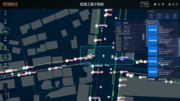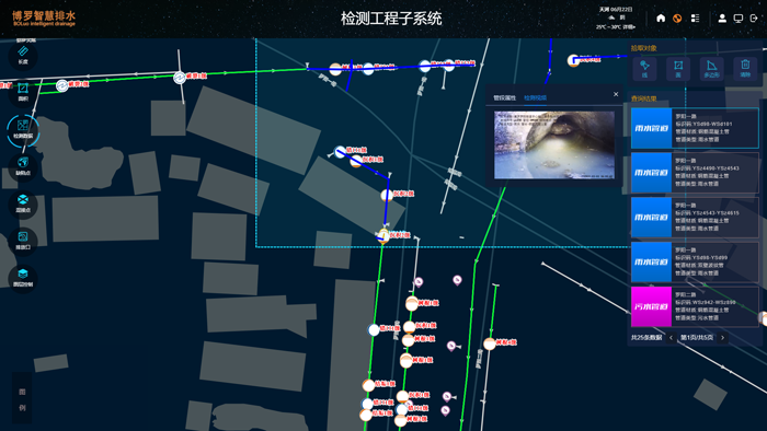 检测系统提供全面的管道缺陷管理功能,系统能快速将工程范围的管道缺陷位置、类型、等级等一张图管理功能,实现在线查询工程资料、一键观看检测视频、缺陷图片、排放口图片与混接点图片等操作,快速定位与查看相关工程资料,提高工作效率。